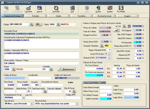 Existe também vínculos entre peças equivalentes, informações do Fabricante, Grupos e Fornecedores.Outra facilidade é o cálculo do Preço de Custo que agrega, IVA, IPI, ICMS, Frete e outras custos importantes. O Sistema permite até 3 Preços de Venda distintos determinados por fatores percentuais ou em tabela de itens de custo determinada pelo usuário do programa. O cadastro completo e os preços de Custo e de Venda também podem ser gerados automaticamente de acordo com tabelas (planilhas em Excel) fornecidas pelos fabricantes.