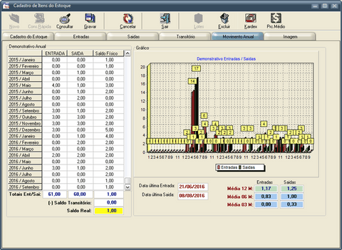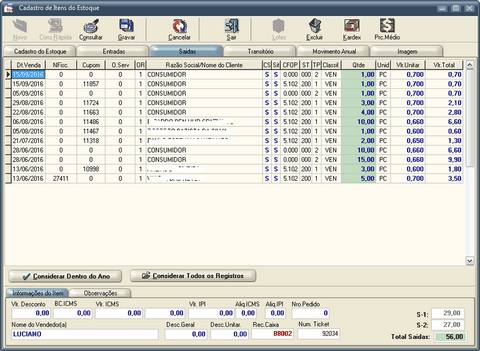 Da mesma forma as devoluções e cancelamentos de venda estão solucionados pelo Sistema de Crédito. Vários tipos de consultas estão disponibilizados inclusive histórico do movimento de cada item a clientes e fornecedores. A visão do Sistema é de 36 meses enfocando Entradas / Saídas / Saldos / Médias. Relatórios demonstram a rotatividade do estoque, um ranking de participação do faturamento e a lucratividade por Grupo e Fabricante